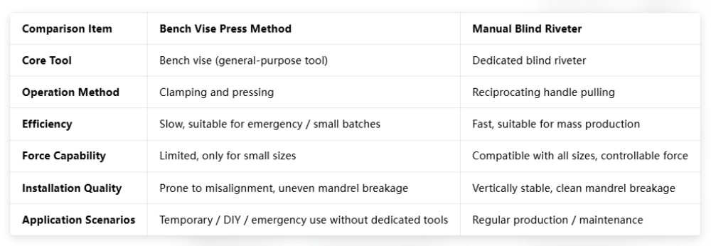 També oferim una comparació per utilitzar una premsa de cargol de banc i una rematxadora cega manual.